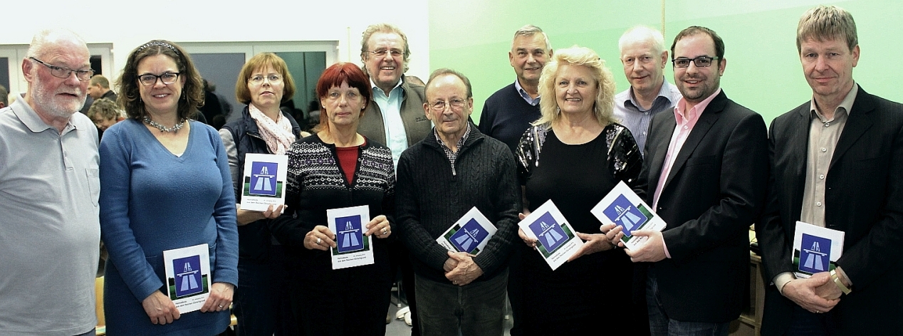Abb. 2: Vorstellung des 29sten "Heimatboten" aus dem Reichen Ebrachgrund am 27. Nov. 2015 in Mühlhausen, die anwesenden Autoren von links nach rechts: Franz F. Kachler, Angela Nusser, Ingrid Geyer, Ursula Lebender, Heinrich Weniger, Helmut Schleicher Otto Pröls, Evi Seeger, Rudi Schmidt, Christian Enz, Dr. Manfred Welker. Foto: Enz