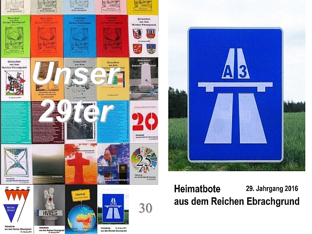 Ausblick. - Mit der Zahl 30 kommt im Jahr 2017 für den HVREG die Verpflichtung, doch wohl eher die Chance, an die Gründung unseres HVREG im Jahr 1987 erinnern zu dürfen. So Gott will, wird unser Heimatbote dann im 30sten Jahrgang erscheinen. Voraussetzung ist, dass sich wiederum begabte und entschlossene Damen und Herren finden mögen, die beitragen, diesen kommenden Jahresband mit Liebe und Sachverstand, insbesondere zu dem kleinen Jubiläum, auszufüllen. Bleibt zu hoffen, dass möglichst viele Beitragsvoranmeldungen bis Ende April 2016 vorliegen werden. Für die Manuskriptabgabe ist der August 2016 einzuplanen. (ffk)